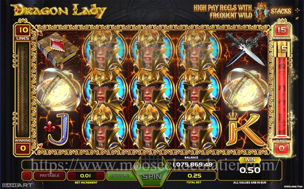 Ketika Dragon Lady muncul di gulungan tengah, ia berubah menjadi Expanding Wild, menutupi seluruh reel dan meningkatkan peluang menang besar.