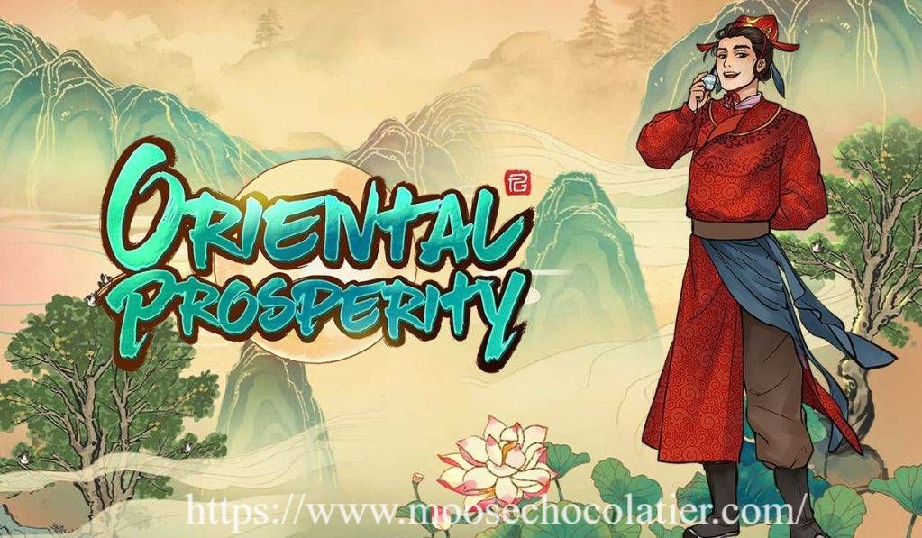 Oriental Prosperity menampilkan latar kuil dan taman Asia dengan dominasi warna merah dan emas. Simbol utama di gulungan meliputi: